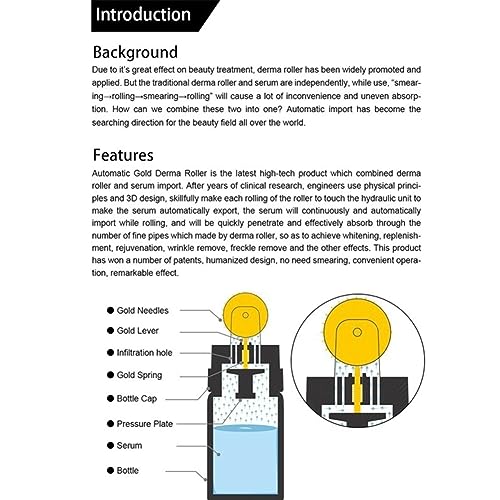 ღღDesign 3D: utilizza i principi fisici e il design 3D e fa sì che ogni rotolamento della ruota tocchi la valvola dorata per esportare automaticamente il siero nella bottiglia. Il siero verrà importato automaticamente mentre il microago del rullo scorre sulla pelle.