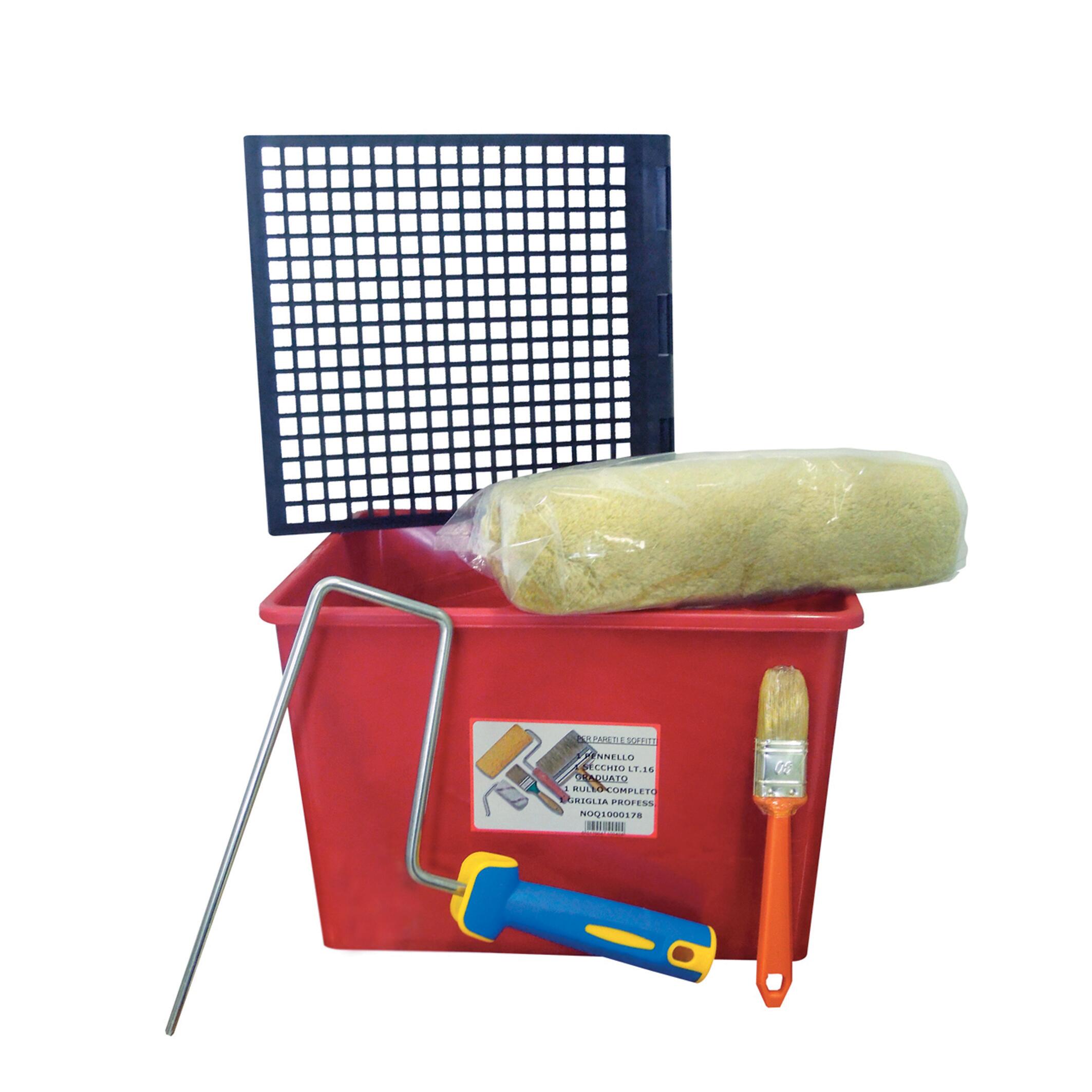 In plastica, ferro, contiene: secchio da 16lt, rullo, rete e pennello in setola mista