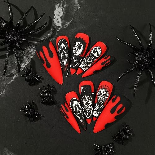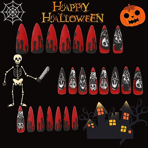 RUNBFUUY Press on Nails Long Coffin, Red & Black Halloween Horror Design, Full Cover Stick on Nails, Reusable Nails Press on Stick on Nails for Halloween Day 24Pcs
