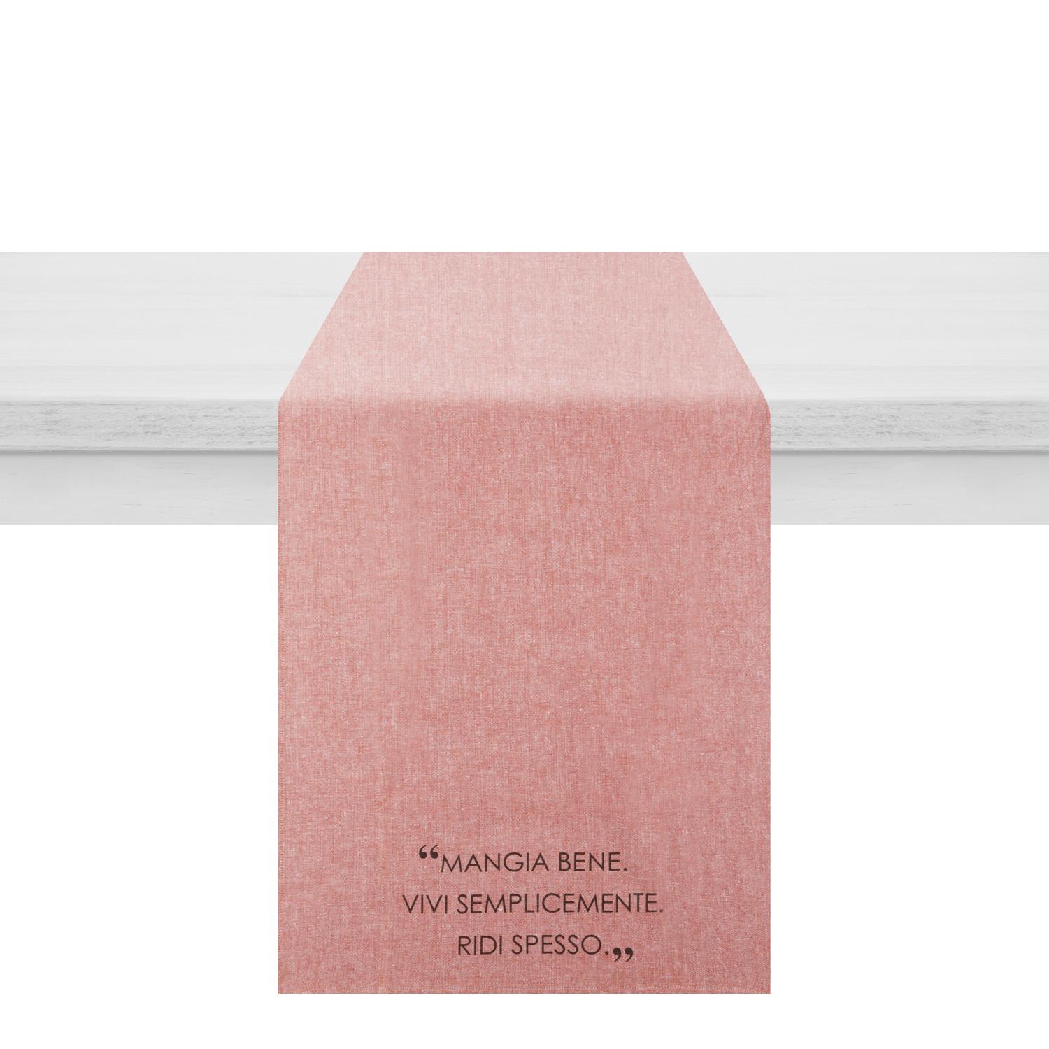 Il runner è la soluzione tessile, pratica e al contempo elegante, per apparecchiare una tavola per 2 persone. La trama in misto cotone, resistente e morbida, è caratterizzata da un delicato colore rosso ruggine e la scritta Mangia bene, vivi semplicemente, ridi spesso. Starà benissimo anche sul tavolo posizionato come base centro tavola. Lavabile con ciclo a 30°. Misure: 45x150 cm.