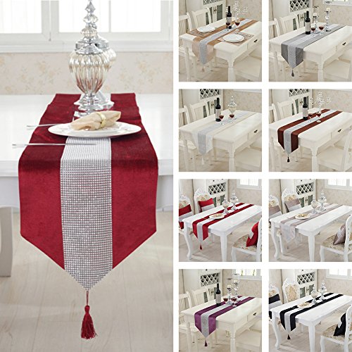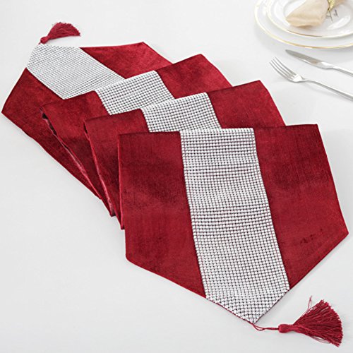 Runner da tavola con nappa e paillettes, con strass, classico ed elegante, in finto velluto, Red, 32 * 180cm