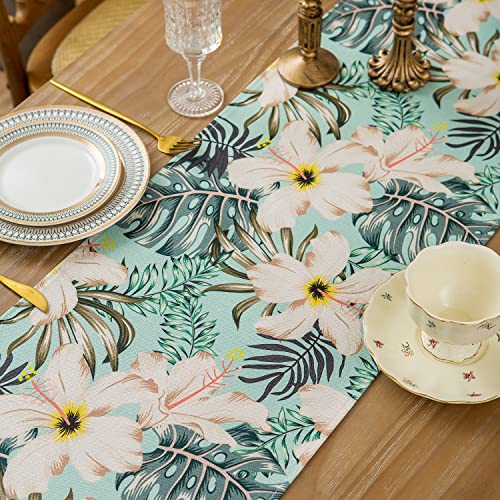 Runner da Tavola Verde Acqua Fiore Bianco e Foglie Runner da Tavola in Lino Moderno ed Elegante Tovaglia Fattoria Cucina Decorativa da Pranzo per Tavolo Ristorante Festa 40x140 cm