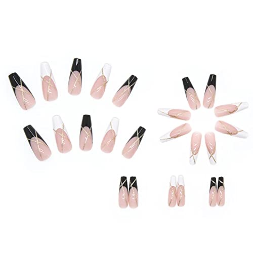 RUNRAYAY 24 Pz Press On Nails Unghie Finte Lunghe, Balletto Francese In Acrilico Bianco e Nero con Chiodi di Design In Lamina D'Oro per Donne e Ragazze