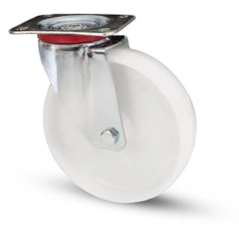 Ruota in poliammide 6. Mozzo su cuscinetti a sfere schermati assemblati con distanziale centrale, gabbia a rulli o foro passante. Supporti Tipo Medio In acciaio stampato zinco-cromato rotanti su doppia corona di sfere. Assemblaggio con dado autobloccante. Anello parapolvere sul giro di sfere. SKU AVO/05118S01500FN Manufacturer AVO
