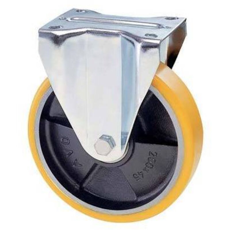 Articolo 22/A in ghisa rivestita di poliuretano. Mozzo su cuscinetti a sfere schermati. Supporto in acciaio stampato con piastra fissa. Diametro mm 125x25 Portata 170 kg