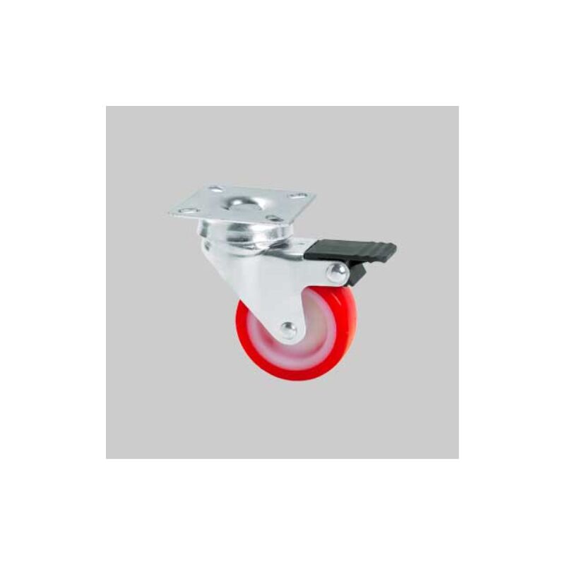 Supporto a piastra girevole in acciaio stampato rotante su doppia corona di sfere con freno. Rivestimento in poliuretano arancio e nucleo in poliammide. Ruota arredamento art. 235bis avo c/freno 50 mm - portata 20 kg ALDO VALSECCHI Ruote avo