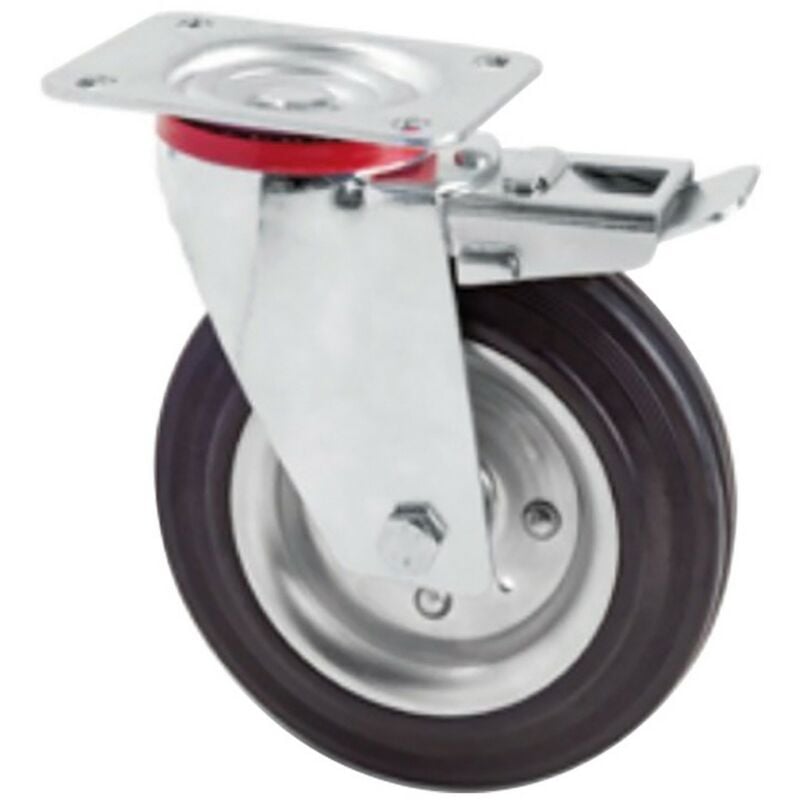 IN GOMMA, CON FLANGE IN ACCIAIO STAMPATO ZINCO-CROMATO. SUPPORTO GIREVOLE, FORO PASSANTE. DISPOSITIVO DI BLOCCAGGIO RUOTA.ø MM 100 X 30 PORT. KG 70