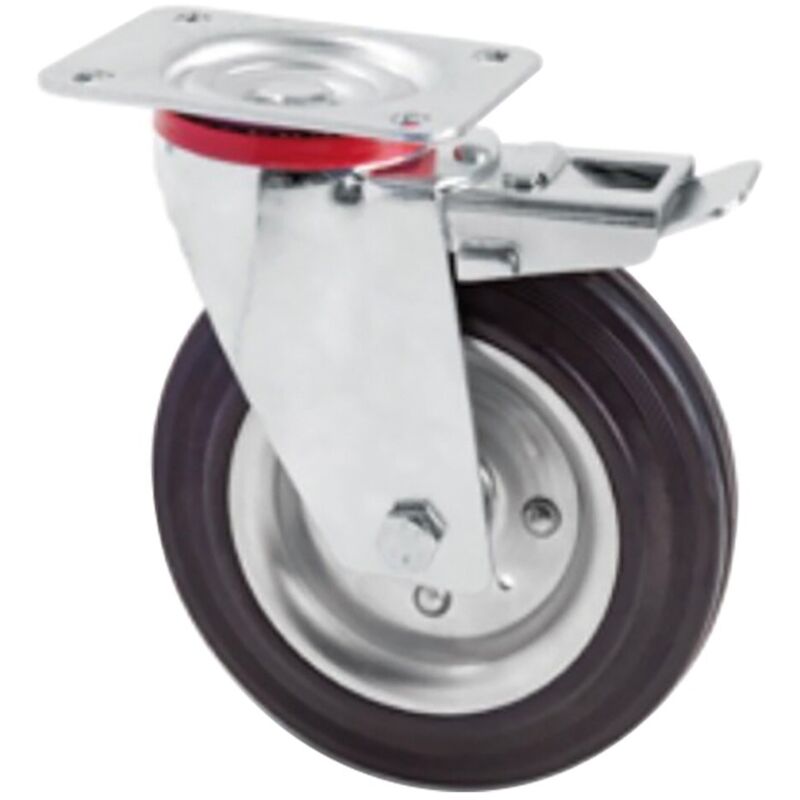 In gomma, con flange in acciaio stampato zinco-cromato. Supporto girevole, foro passante. Dispositivo di bloccaggio ruota.. ø mm 125 x 38 port. kg 100. Prezzo inteso per: 1 PZ
