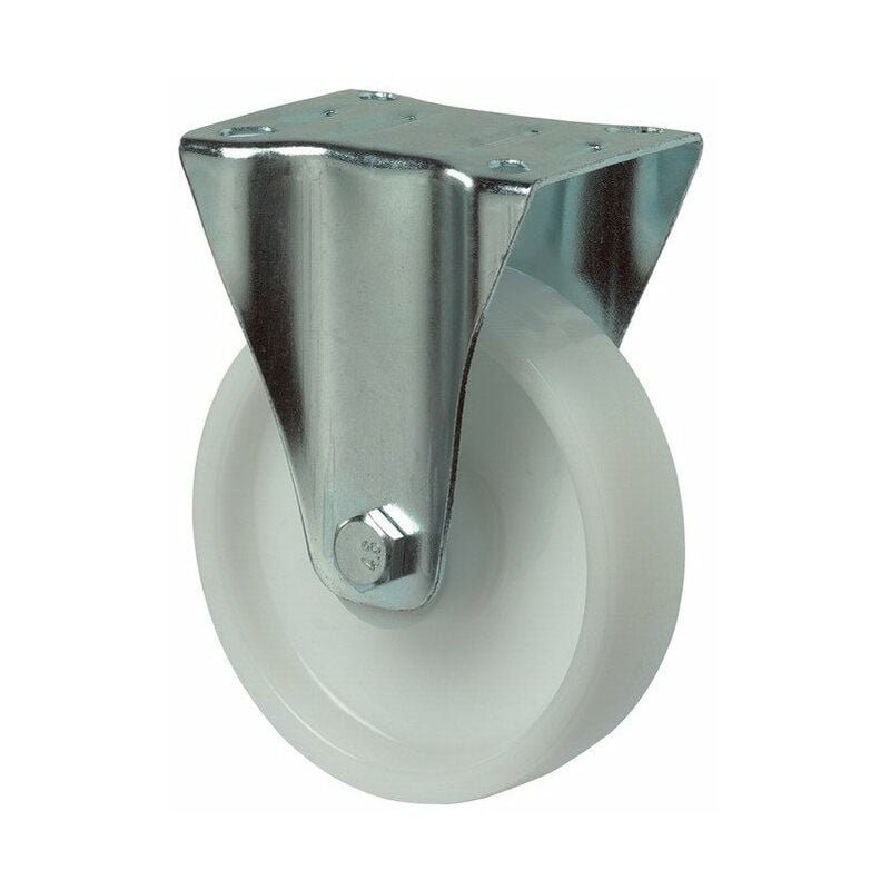 Rotolo di attrezzature da trasporto · alloggiamento stabile in lamiera d'acciaio, zincato-cromato · Asse ruota avvitato · Cuscinetti a rulli (ruota Ø 58 mm con cuscinetti semplici) · Ruote di plastica, bianche, resistenti alla corrosione, resistenti alla benzina, al diesel, agli oli e ai grassi vegetali e animali Altre caratteristiche tecniche: · Foro a vite Ø: 11mm · Tipo di attacco: con piastra a vite · Rimozione del foro a vite: 80 x 60 mm
