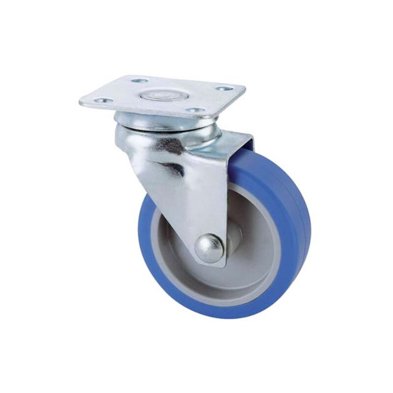 Supporto in acciaio stampato rotante su doppia corona di sfere. Finitura zincocromata. Ruota in gomma sintetica flangiata in termoplastico.