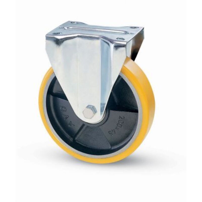 RUOTA A FORCELLA SU PIASTRA 22A AVO A/ZINCR/POL.GIAL D/GHISA D.MM 80X20 P.MM 100X85. RUOTA A FORCELLA SU PIASTRA 22A AVO A/ZINCR/POL.GIAL D/GHISA D.MM 80X20 P.MM 100X85. RUOTA A FORCELLA SU PIASTRA 22A AVO A/ZINCR/POL.GIAL D/GHISA D.MM 80X20 P.MM 100X85. Con rivestimento in poliuretano AVOLAN. Nucleo in ghisa meccanica di qualità, verniciata color nero. Mozzo su cuscinetti a sfere schermati assemblati con distanziale centrale.N