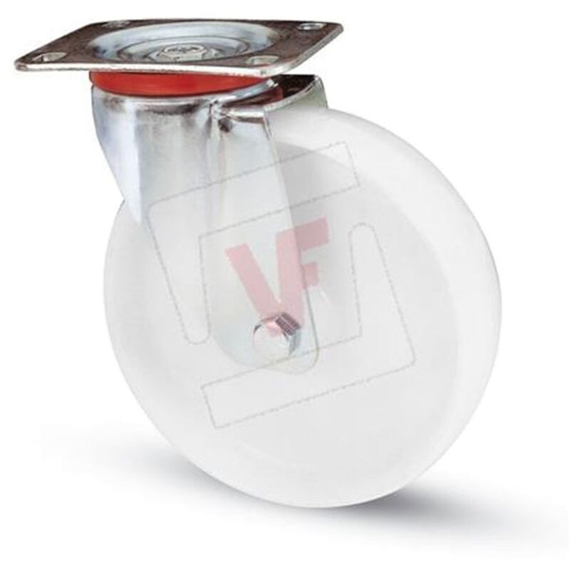 In nylon, mozzo su cuscinetti a rulli, supporto in acciaio stampato zincocromato rotante su doppia corona di sfere, assemblaggio con dado autobloccante.