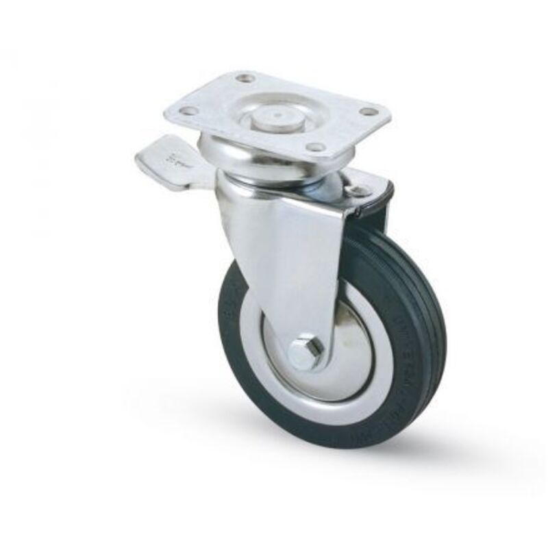 In gomma, supporto in acciaio cromato rotante su corona di sfere, assemblaggio con dado autobloccante, con bloccaggio ruota e piastra.
