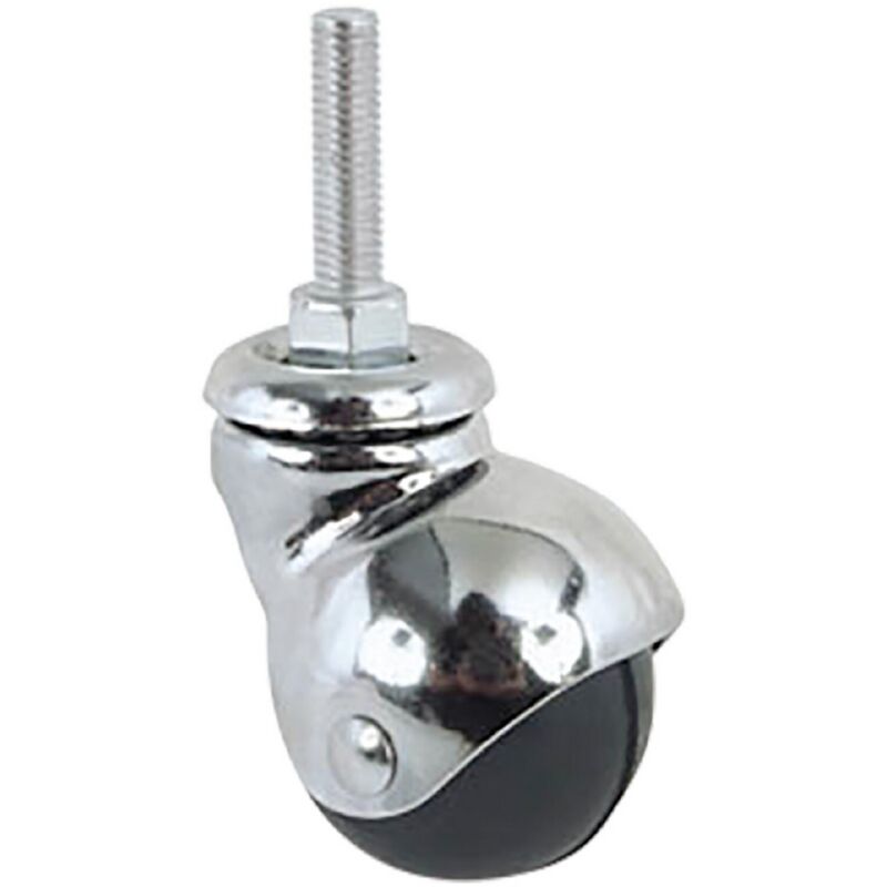 In gomma nera, supporto a cuffia sferica in acciaio rotante su doppia corona di sfere a perno filettato. Impiego consigliato per mobili ufficio, mobili metallici, espositori.