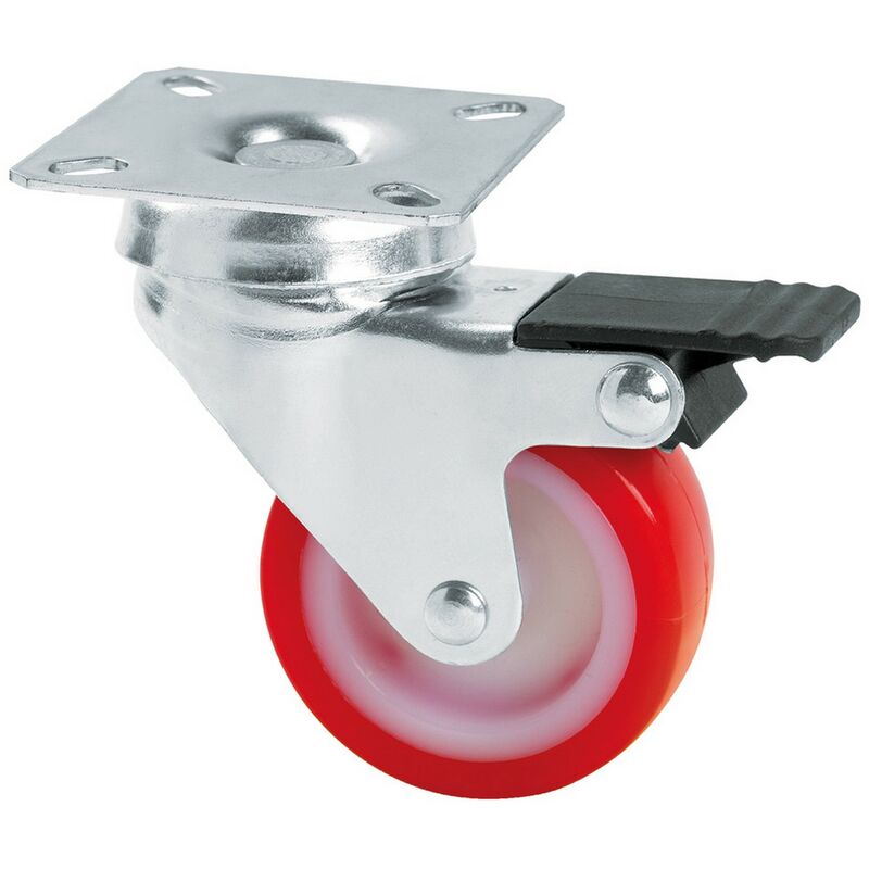 IN POLIURETANO ARANCIONE NUCLEO IN POLIAMMIDE, CON SUPPORTO IN ACCIAIO STAMPATO ZINCO-CROMATO. SUPPORTO ROTANTE A PIASTRA SU DOPPIA CORONA DI SFERE. DISPOSITIVO DI BLOCCAGGIO RUOTA.ø 40 - PIASTRA MM 40 X 40