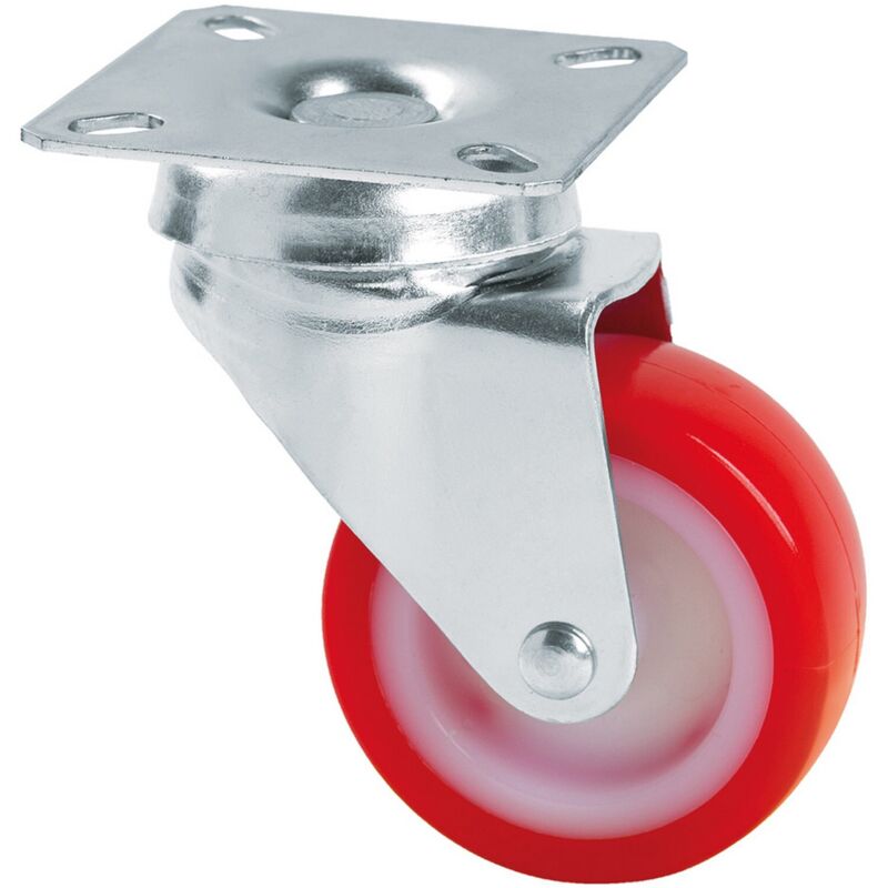 In poliuretano arancione nucleo in poliammide, con supporto in acciaio stampato zinco-cromato. Supporto rotante a piastra su doppia corona di sfere. 60 - piastra mm 60 x 60