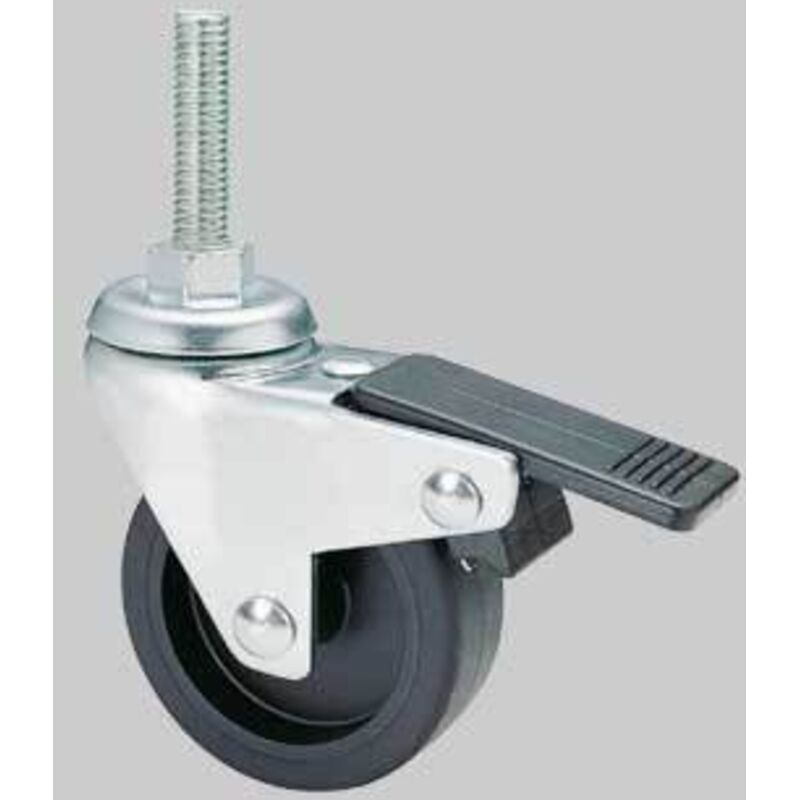 RUOTA IN NYLON PERNO M8X30 CON FRENO mm. 40 Supporto in acciaio stampato rotante su doppia corona di sfere, con dispositivo di bloccaggio ruota.Esecuzione: zinco-cromato.Ruota in gomma sintetica nera o grigia flangiata in termoplastico.L'impiego è consigliato per mobili d'ufficio, espositori, elettrodomestici, attrezzature ospedaliere, etc. Disponibile anche con assemblaggio vite e dado. Viti Suggerite: M 8-10 x 15-30Altezza: 56 mmAttrito Statico: 200 NAttrito Dinamico: 150 N