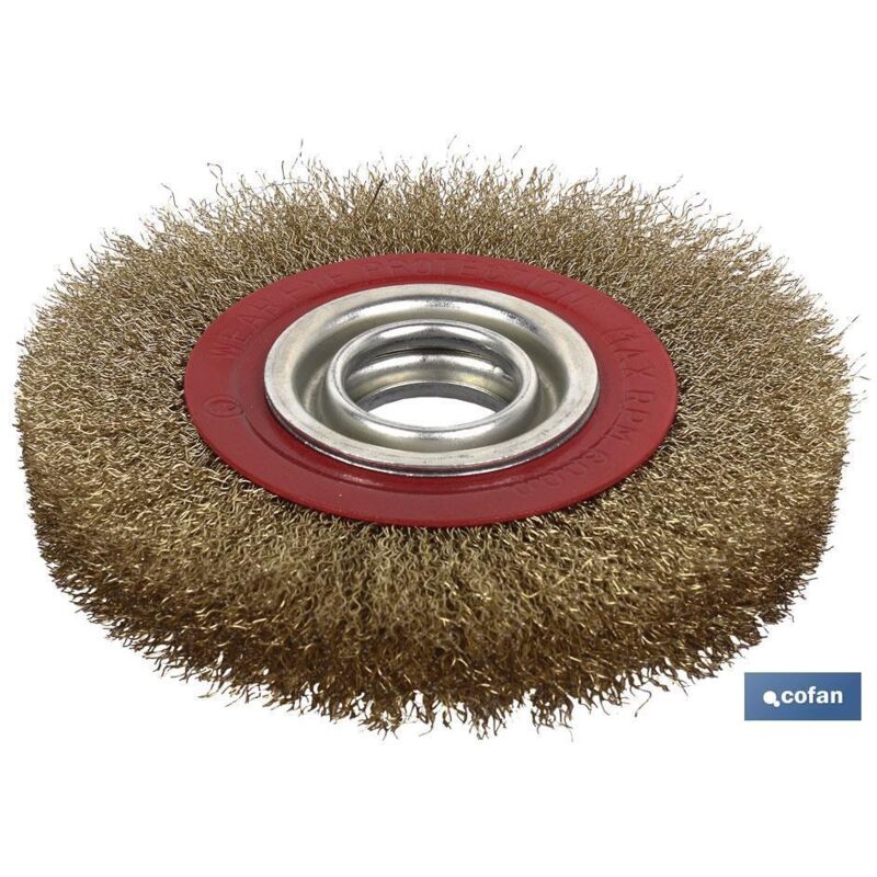 Ruota in filo ondulato in acciaio ottonato. 0,3 mm Ø Caratteristiche tecniche: Diametro filo: 0,3 mm Diametro [mm]: 250 mm Giri/min: 3.000 < /li> Misura dell'albero: Ø32mm