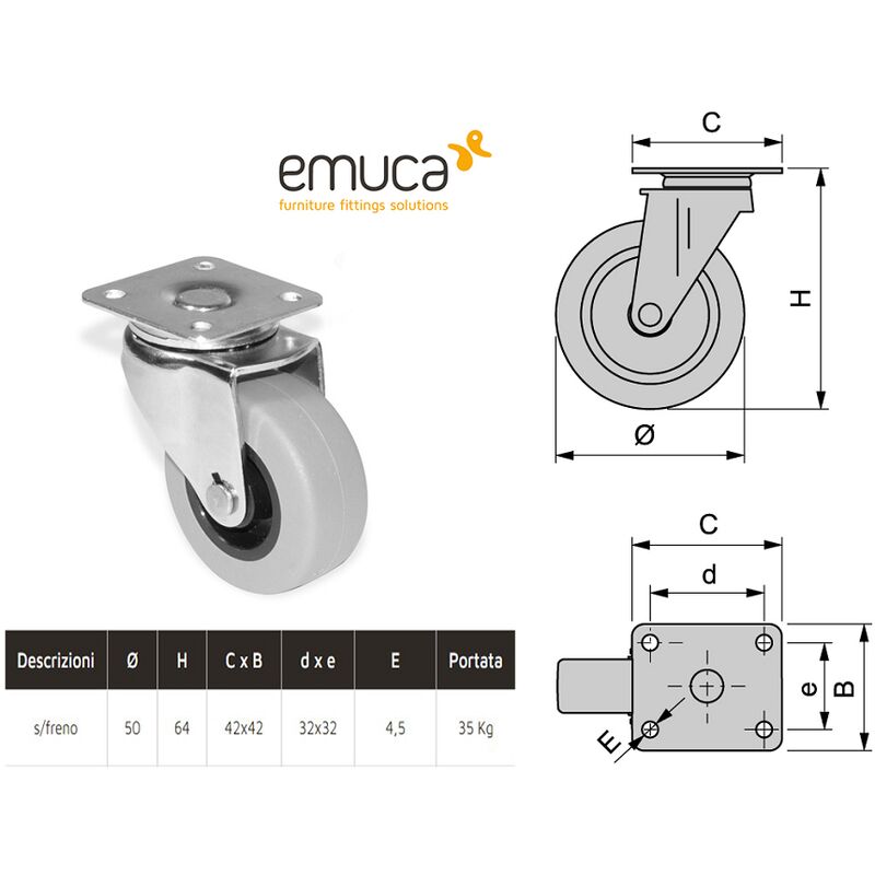 Ruota, marca Emuca Caratteristichetecniche: -Ruota Plastica Grigia -Nucleo in polimero termoplastico -Anello in gomma piena grigia antitraccia -Supporto ruotante in acciaio cromato opaco. -Piastra girevole mm.43x43 -Portata: Kg. 35 -Diametro: mm. 50 La confezione comprende: -nr.01 Ruota Perché scegliere Emuca? Nel Gruppo Emuca progettiamo, fabbrichiamo e commercializziamo un'ampiagamma di prodotti destinati ai settori del mobile, ferramenta e bricolage. Le nostre sedi a Valencia (Spagna), Padova (Italia), Chelmsford (Regno Unito),Nantes (Francia) e Lisbona (Portogallo) ci permettono di essere in contattodiretto con le ultime tendenze del settore del mobile che il nostroDipartimento Ricerca & Sviluppo trasferisce poi ai nostri prodotti. Per garantire l'efficienza delle nostre operazioni contiamo, in Spagna, su unafabbrica che offre soluzioni integrali in alluminio. Siamo rivenditori di Ruote Girevoli, Fisse o ad Incasso ZingaroWeb è rivenditore di Ruote Girevoli, Fisse o ad Incasso .