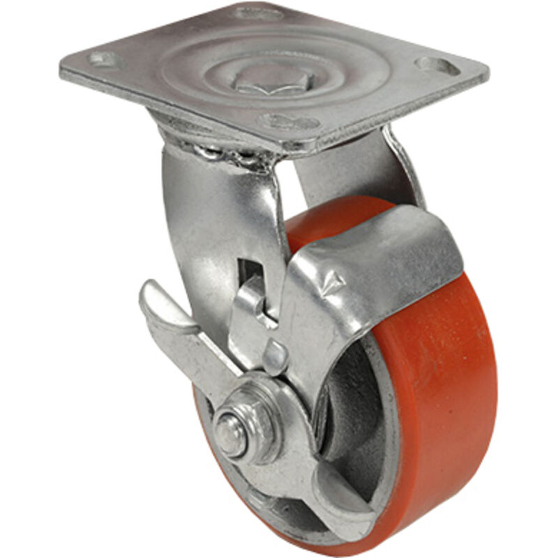 In ghisa rivestita di poliuretano. Supporto in acciaio con piastra girevole. Con freno. Diametro mm 75x32. Portata 100 kg