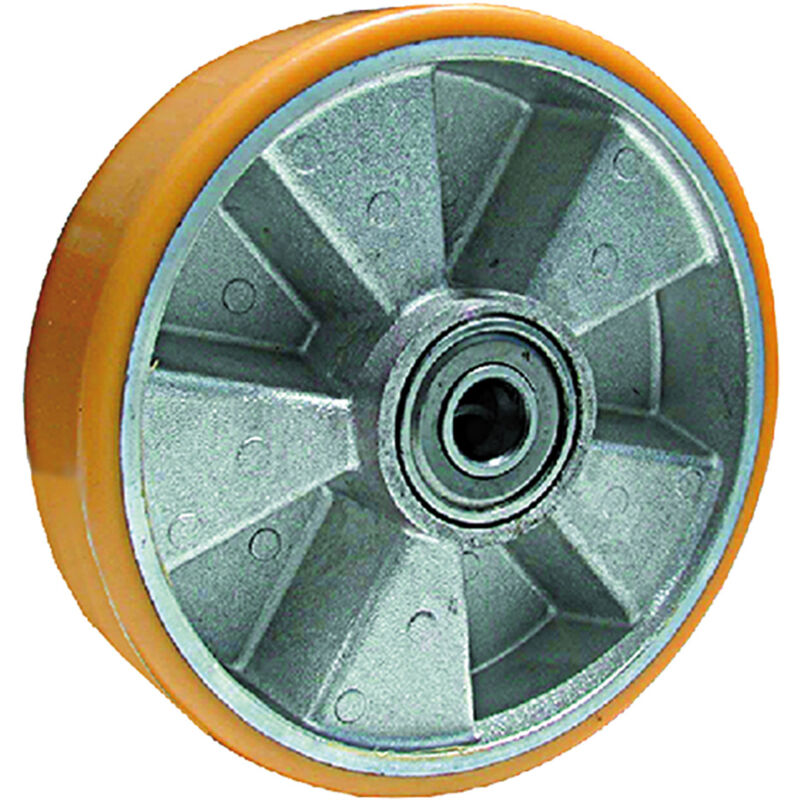 Con rivestimento in poliuretano avolan. Con supporto in alluminio flangiato. Mozzo su cuscinetti a sfera.