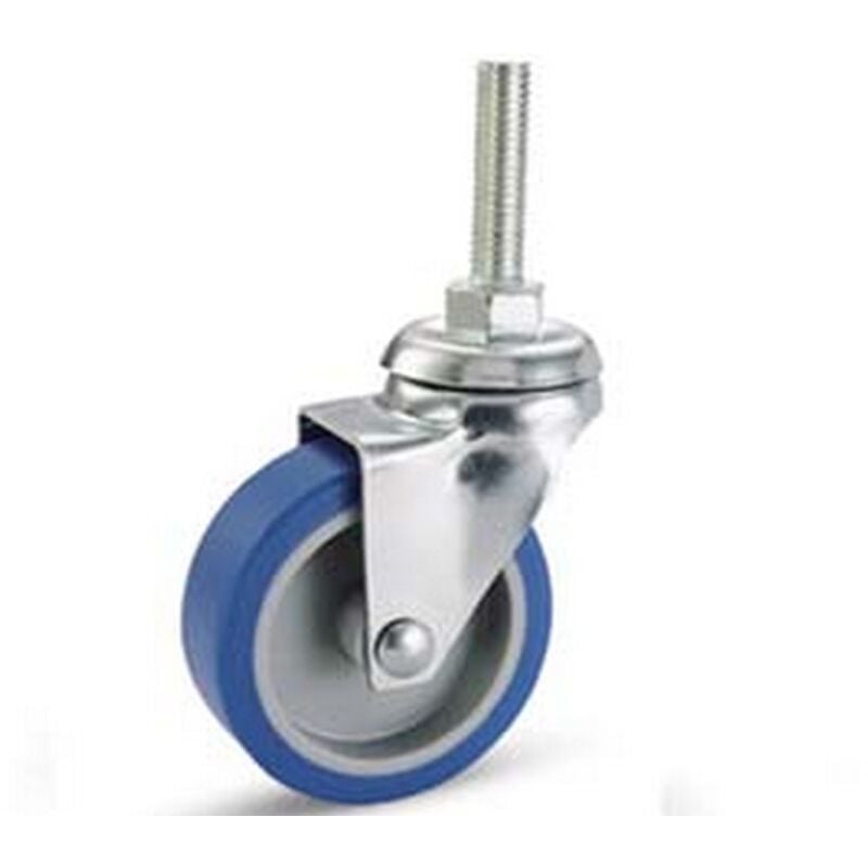 Supporto in acciaio zinco-cromato stampato rotante su doppia corona di sfere - ruota in gomma sintetica blu, durezza 97 sha +/-? flangiata in termoplastico - l'impiego ? consigliato per mobili d'ufficio, espositori, elelttrodomestici, attrezzature ospedal