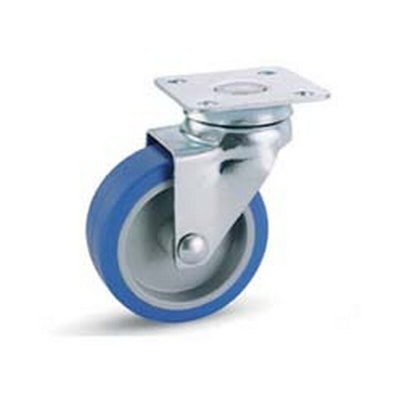 Supporto in acciaio zinco-cromato stampato rotante su doppia corona di sfere - ruota in gomma sintetica blu, durezza 97 sha+/-? flangiata in termoplastico - l'impiego ? consigliato per mobili d'ufficio, espositori, elelttrodomestici, attrezzature ospedali