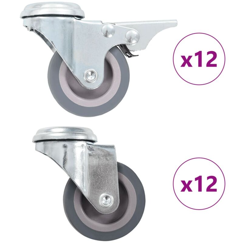 Questo set, composto da 24 rotelle girevoli con foro per bullone, costituisce l'accessorio perfetto per attrezzature e mobili di piccole dimensioni come banchi da lavoro, carrelli, tavolini da caffè, piantane, scaffali, carrelli della spesa, etc. Le ruote sono realizzate in TPR (gomma termoplastica), un materiale che si distingue per una buona resistenza agli urti e alle vibrazioni e che consente alle ruote di girare in modo fluido e silenzioso. La loro superficie morbida, inoltre, protegge efficacemente il pavimento dai graffi. La struttura in ferro zincato è altamente resistente alla ruggine e garantisce maggiore robustezza e durata delle ruote. Metà delle ruote girevoli sono dotate di sistema frenante per garantire una maggiore flessibilità di utilizzo. Ogni ruota ha una capacità di carico massima pari a 35 kg. La consegna include 12 ruote girevoli con foro per bullone e 12 ruote girevoli con foro per bullone e freno. Colore: Grigio Materiale: TPR (gomma termoplastica) e ferro