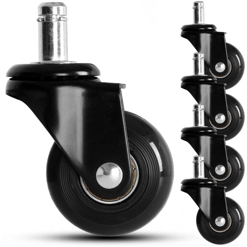 Set di 5 ruote in gomma Ricky per poltrone e sedie Colore: nero | materiale: gomma Un set di 5 ruote in gomma Ricky eHokers è la soluzione ideale per chi vuole rinnovare la propria sedia girevole o migliorarne la funzionalità. Queste ruote sono realizzate in gomma di alta qualità, che garantisce durata e resistenza all'abrasione. Grazie a loro, la sedia si muoverà facilmente e senza intoppi sul pavimento, aumentando la comodità e il comfort di utilizzo. Uno dei vantaggi più importanti di queste ruote è la loro versatilità. Si adattano alla maggior parte dei modelli di sedie girevoli, quindi possono essere facilmente installati. Queste ruote sono anche facili da pulire. Inoltre, le ruote in gomma sono migliori per il pavimento rispetto alle ruote in plastica o metallo perché non graffiano la superficie e non si deformano facilmente. Sono anche più silenziosi rispetto a quelli realizzati con altri materiali, il che è particolarmente importante negli uffici. Il set include 5 ruote, che