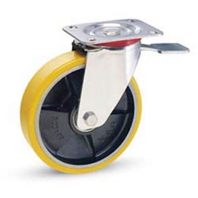 Supporto tipo medio fisso fisso in acciaio stampato zinco-cromato con dispositivo di bloccaggio rotazione ruota - ruota con rivestimento in poliuretano avolan sh a 91 - nucleo in ghisa meccanica di qualit? - mozzo su cuscinetti a sfere schermati assemblat