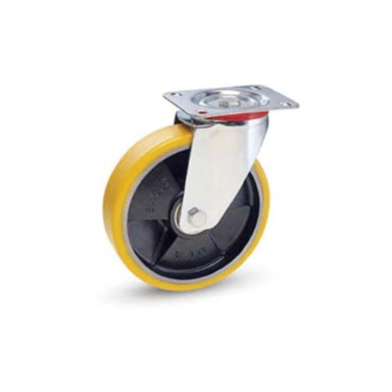 Ø mm.100x25 piastra mm.100x85 - 128h. 120dan supporto tipo medio fisso rotante in acciaio stampato zinco-cromato ruota con rivestimento in poliuretano avolan sh a 91 - nucleo in ghisa meccanica di qualità - mozzo su cuscinetti a sfere schermati assemblati con distanziale centrale - assemblaggio con dado autobloccante - anello parapolvere sul giro di sfere Categoria merceologica: Ruote - Ferramenta - Ruote industriali