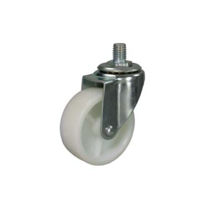 Ø mm.50 perno ø mm.10x25 ruota in polimero termoplastico, supporto maggiorato in lamiera stampata e zincata, rotante su corona di sfere, ruota colore bianco Categoria merceologica: Ruote - Ferramenta - Ruote per mobili