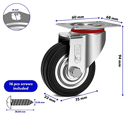 GBL Ruote robuste + viti, 75 mm fino a 200 kg, set di 4 rotelle silenziose, senza segni sul pavimento, per mobili, ruote di carrello, rivestite in gomma, ruote argentate