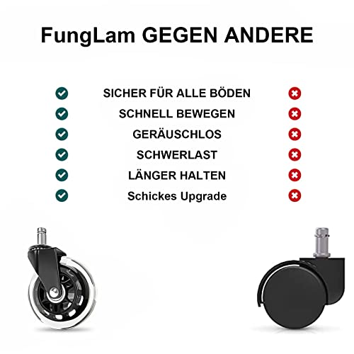 Silenzioso, silenzioso, durevole. Le ruote per sedie in acciaio di alta qualità e gomma possono offrire un carico massimo di 160 kg. Scivola completamente senza alcun rumore sulla tua sedia da ufficio. Anche la sera in casa non sarà più disturbato dal vostro lavoro.