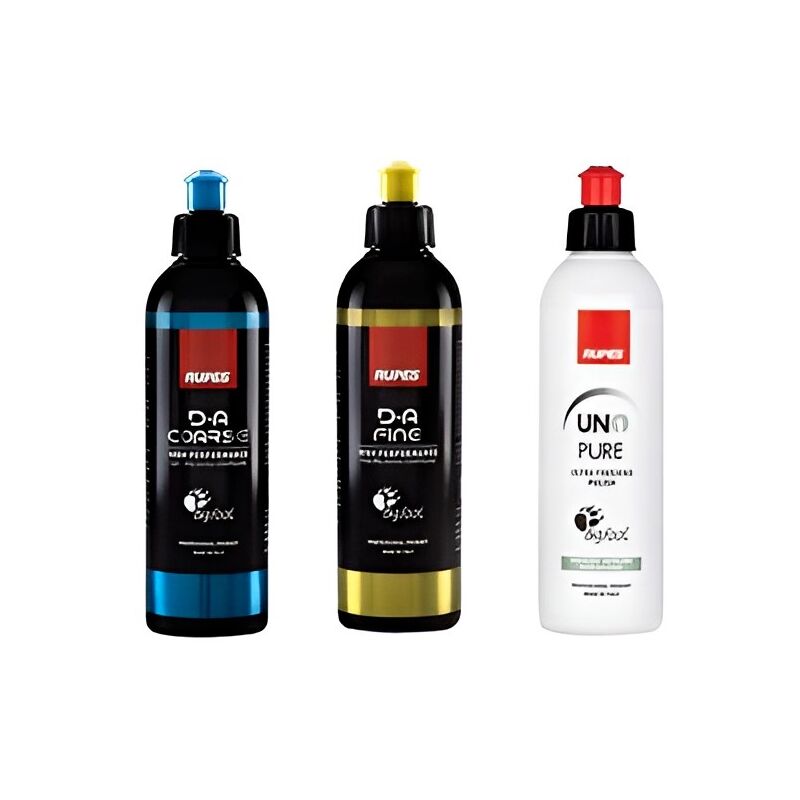 D-A COARSE (1 bottiglia - 250ml) - D-A COARSE è ideale per gli utilizzatori che vogliono una rapida rimozione dei difetti con un'estrema facilità d'uso su tutte le tipologie di vernice. Si consiglia l'utilizzo dei tamponi RUPES D-A COARSE. D-A FINE (1 bottiglia - 250ml) - D-A FINE combina una notevole capacità di taglio con un'ottima finitura. Abbinata ai tamponi gialli in spugna, lana e microfibra, garantisce una facile rimozione dei residui ed un facile utilizzo. UNO PURE (1 bottiglia - 250ml) - UNO PURE è una pasta abrasiva e lucidante, ideale per vernici molto morbide oppure per ottenere una finitura da esposizione anche su colori scuri. Per ottenere risultati ottimali, utilizzare con i tamponi in spugna ultra-fine di RUPES