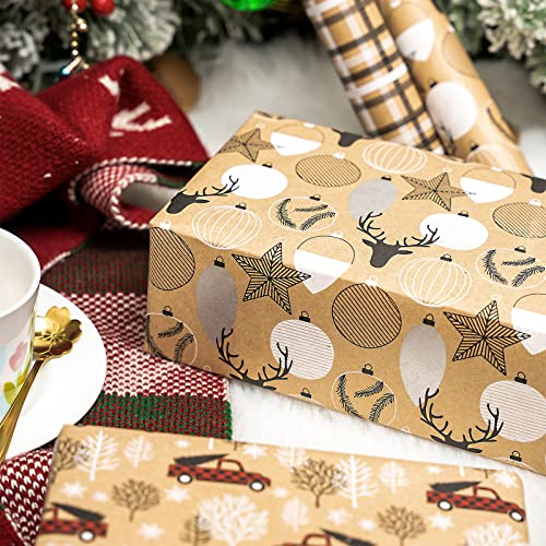 Design: macchine rosse, plaid bianco e nero, cervi e luci colorate natalizie, 3 rotoli di carta kraft marrone sono dotati di etichette regalo e corde di iuta, set perfetto per confezioni regalo.