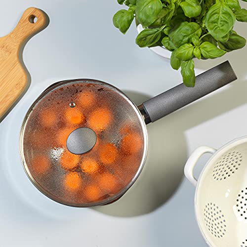 Realizzata con materiali privi di PFOA, questa pentola misura 20 cm e viene fornita con l'apposito coperchio in vetro temperato con sfiato per il vapore.