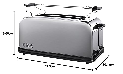 Russell Hobbs Tostapane Lungo, 1200 W, 4 fette larghe di pane, Acciaio Inox, Griglia Integrata Scaldapanini, Toast, Scaldabrioche, Funzione scongelamento, Raccoglibriociole,Adventure Long 4SL,23610-56
