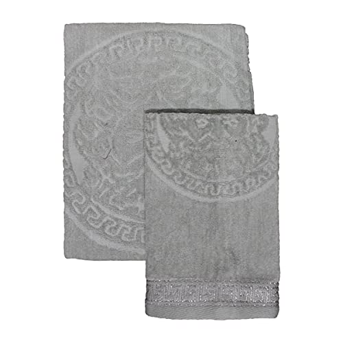 Russo Tessuti Set Asciugamani Spugna Cotone 1+1 Viso e Ospite Poseidon Jacquard Greca-Grigio Chiaro