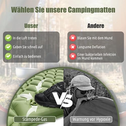 Gonfia e sgonfiaggio rapido: questo materassino autogonfiante dispone di una pompa a pedale integrata, il materassino da campeggio può essere gonfiato facilmente in 3-5 minuti. L'aria dei tappetini isolanti è facile da svuotare.