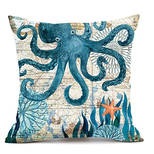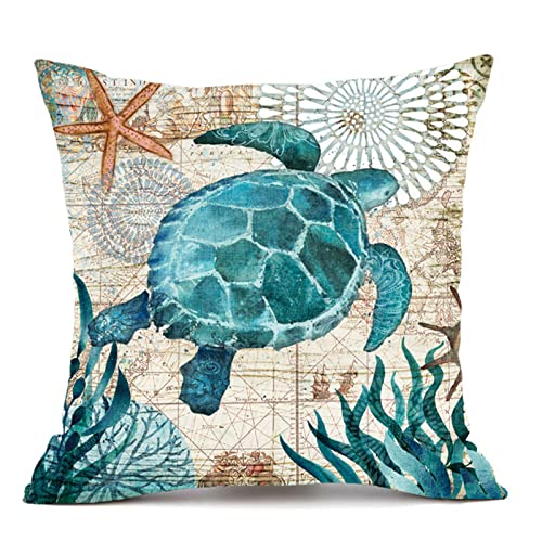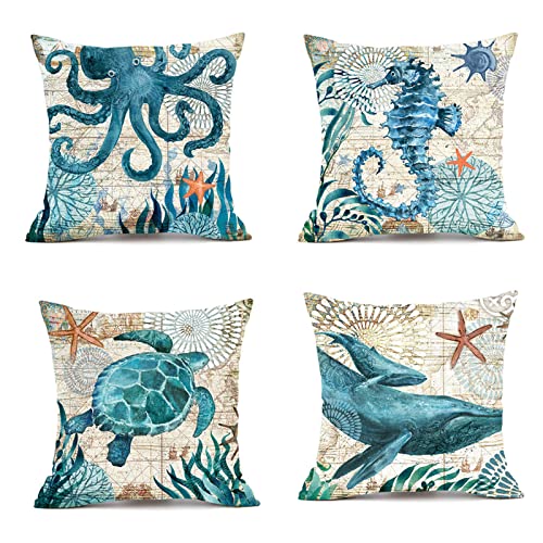 Rwoora Federe per Cuscini Spiaggia Oceano 45 x 45 cm,4 federe con tartaruga di mare, corallo, ippocampo, balena, polpo, per cuscini decorativi per la casa per cuscini per divano e divano