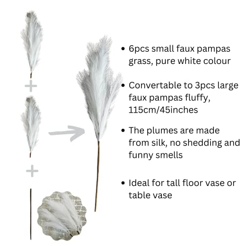 ERBA DI PAMPA PICCOLA E GRANDE: ogni confezione include 6 pezzi di piccola erba di pampa blu con 3 steli, la lunghezza totale è di 45 cm ciascuno. Trasforma 6 pezzi di pampa piccola in 3 pezzi di erba di pampa alta mettendo delicatamente gli steli uno sopra l'altro. Ci sono 9 pennacchi su ogni stelo (18 pennacchi se fai 3 pezzi di grandi pampas), per il miglior effetto soffice erba di pampas. Realizzato in seta.