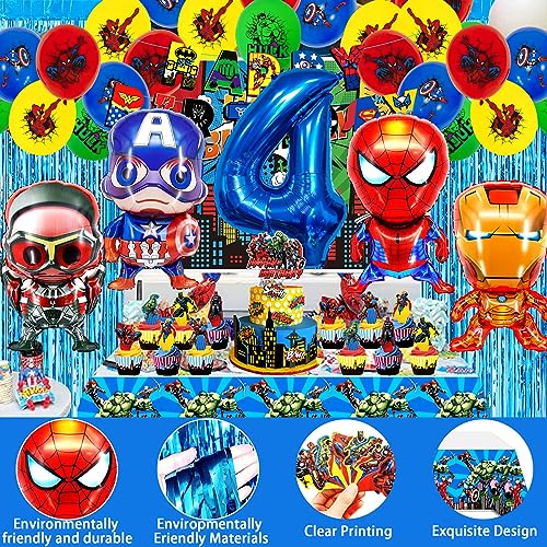 SABAN Palloncini Supereroi 4 Anni, 39 Pezzi Kit Palloncino Compleanno A-vengrs, Decorazioni Compleanno mar-vel 4° per Ragazzi e Ragazze, Torta Spiderma Kit Festa Compleanno Bambino