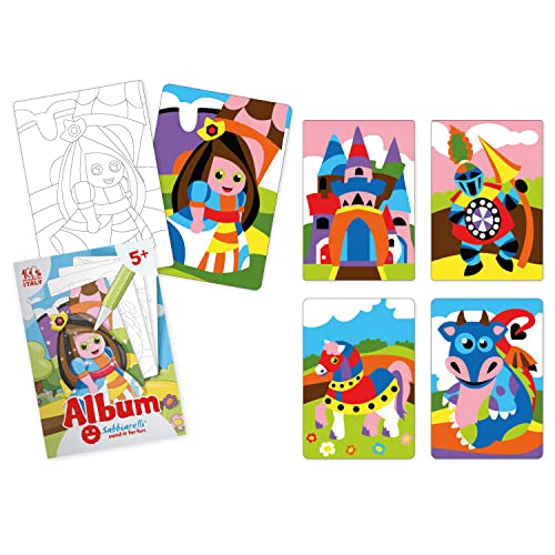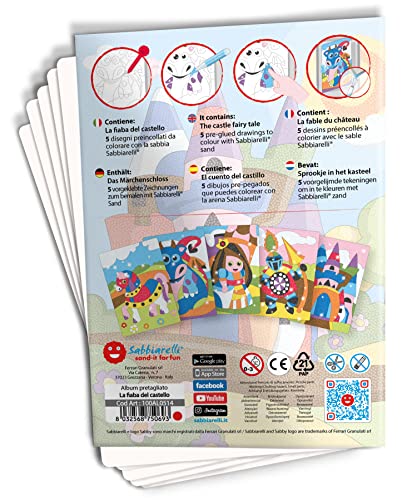 Prodotto: album Sabbiarelli con 5 diversi disegni a tema fiabe nel castello, da colorare con la sabbia. 100% Made in Italy