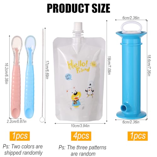 Contenuto del pacchetto: riceverai un kit ricaricabile per le buste per alimenti per bambini, tra cui una macchina per il ripieno di alimenti per bambini di plastica, 4 pezzi di sacchetti per purea per bambini (con motivi casuali), un cucchiaio di silicone e un pennello per la pulizia.