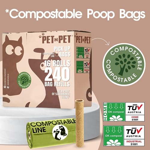 100% SACCHETTI CANE COMPOSTABILI -sacchetti cane Pet N Pet Eco sono realizzati con materiale a base biologica di amido di mais, il che significa che possono essere compostati in strutture di compostaggio municipali e industriali dove sono accettati i rifiuti di animali domestici.