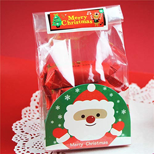 50 pz Sacchetti Biscotto Plastica Sacchettini Trasparenti Alimentari con 50 pezzi di carta natalizia, adesivi per sigillare 5 fogli e 2 rotoli di nastro,Sacchetti di caramelle Biscotti Dolci Sacchetti