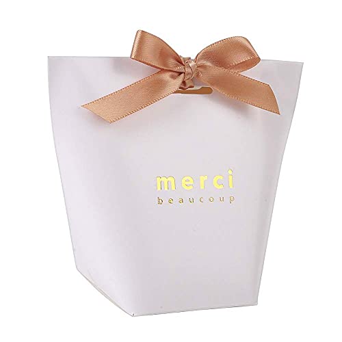 20 PCS Sacchetti Carta Regalo, Sacchetti Carta Kraft Con Scritta "Merci" Bronzing E Nastro, Confezione Regalo Matrimonio, Bomboniera ( Piccolo, Bianco)