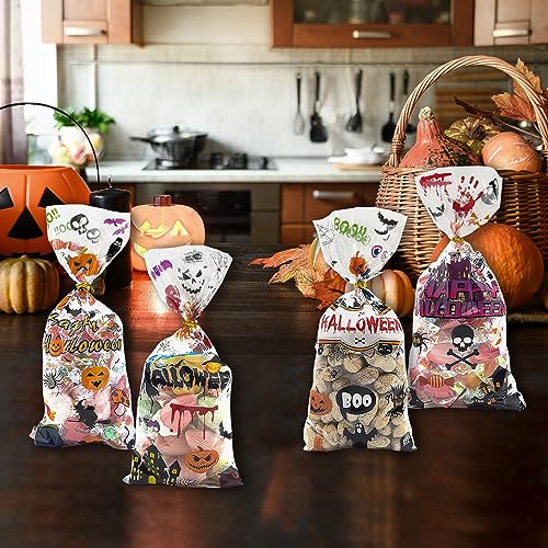 Sacchetti di cellophane di Halloween da 100 pezzi, sacchetto di cellophane trasparente Sacchetti regalo di caramelle dolci con lacci a spirale per forniture per feste di Halloween (4 stili)