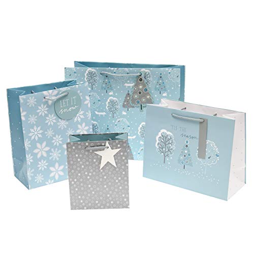 Set di 4 sacchetti regalo natalizi blu, argento e bianco, in 4 motivi coordinati con etichette abbinate.